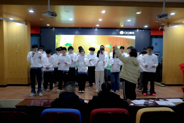 活動當天,學校禮堂內布置得格外喜慶和莊重。背景大屏幕上的紅色和白色圖案交相輝映,屏幕上“唱響青春旋律、綻放夢想之光”與“南京新華2025年迎新班歌大賽”字樣格外醒目,營造出了濃厚的節(jié)日氛圍。